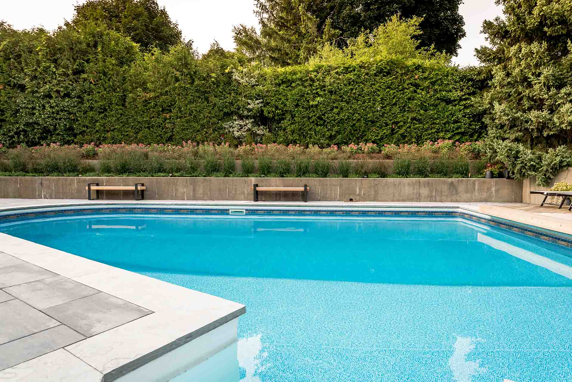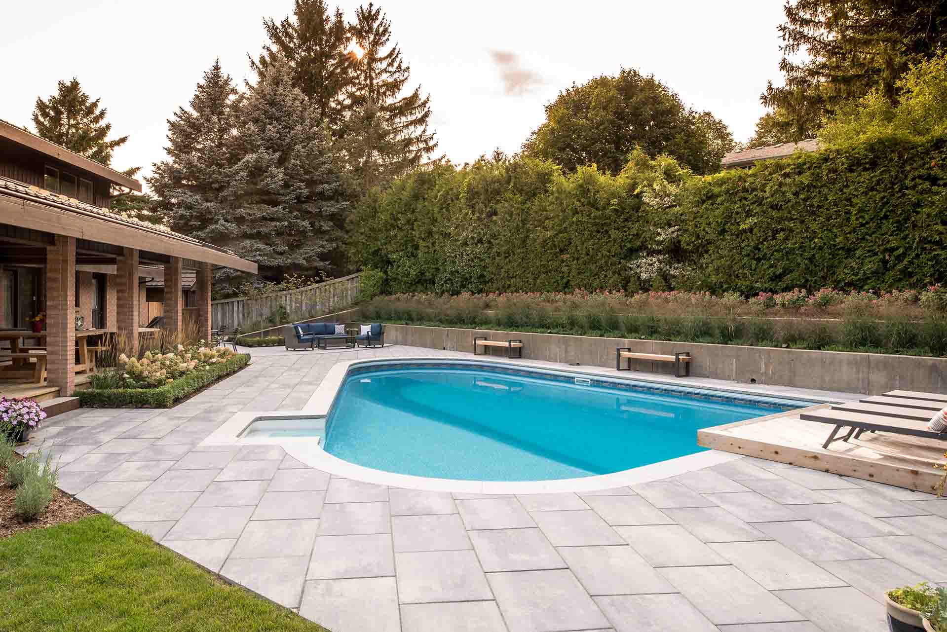 The pool installation is designed as a central visual and experiential feature, reflecting the surrounding architecture, gardens, and sky. Framed by elegant patio surfaces and lush garden installs, the pool feels intentionally placed within the landscape rather than separate from it. Soft plantings and carefully selected materials create a sense of retreat, inviting both quiet moments and effortless entertaining.