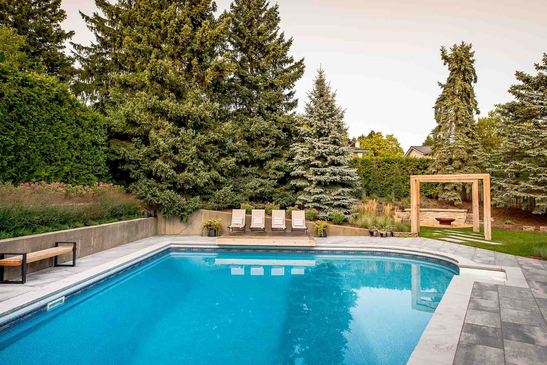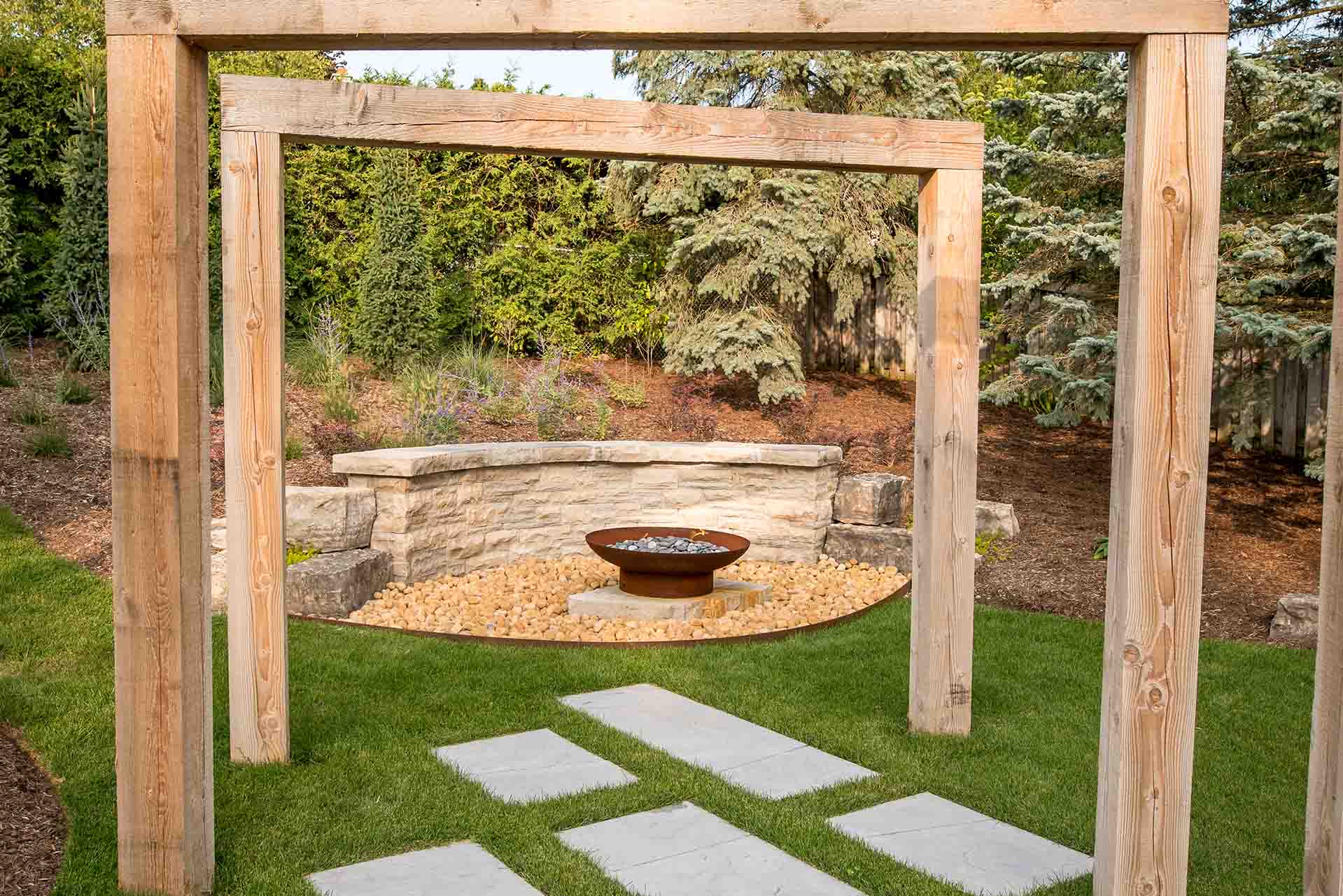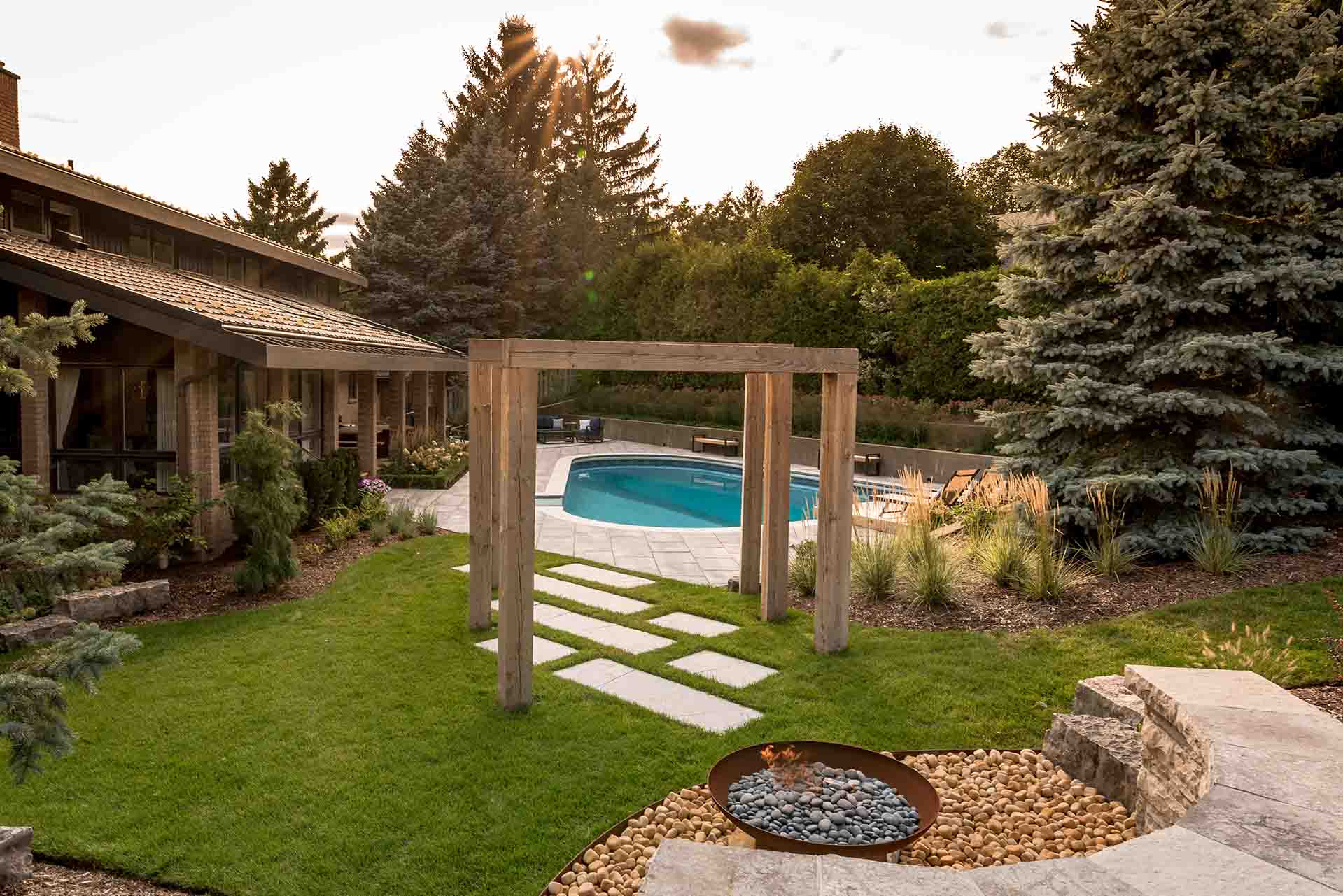 At the heart of the design, a custom metal fire pit serves as a striking sculptural feature and a natural gathering point. Its refined form introduces warmth and contrast, anchoring the patio and surrounding seating areas. Nearby, modern wooden arches define transitions within the landscape, adding architectural rhythm while softly framing views of the garden and pool beyond.