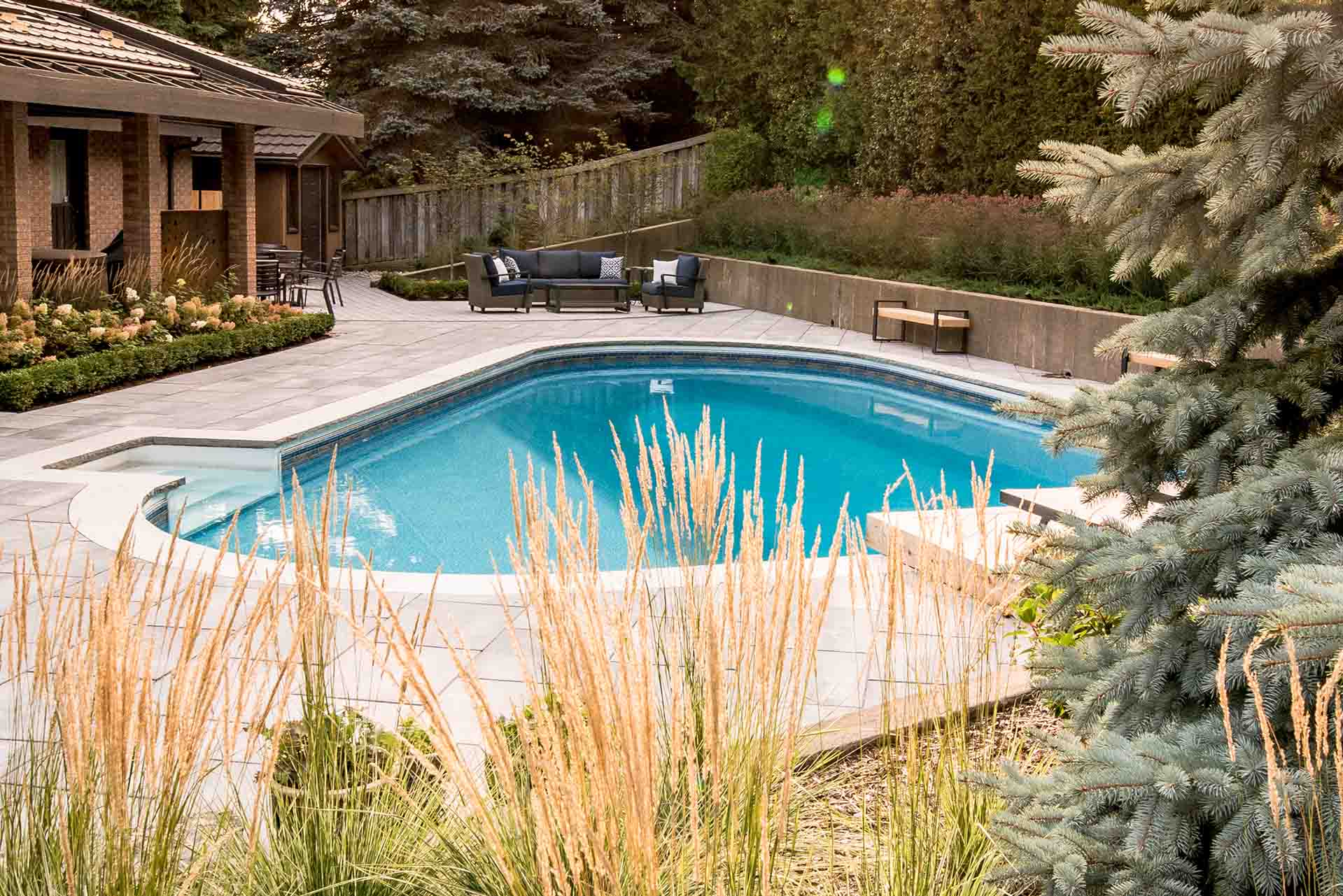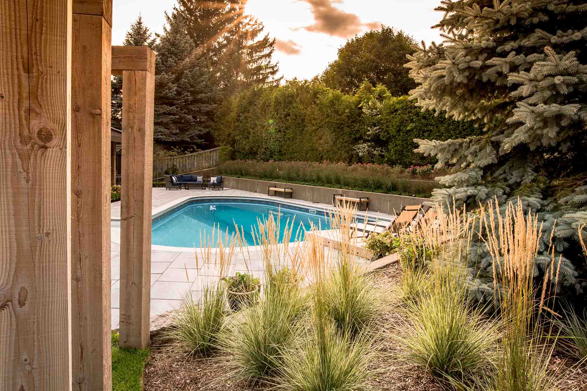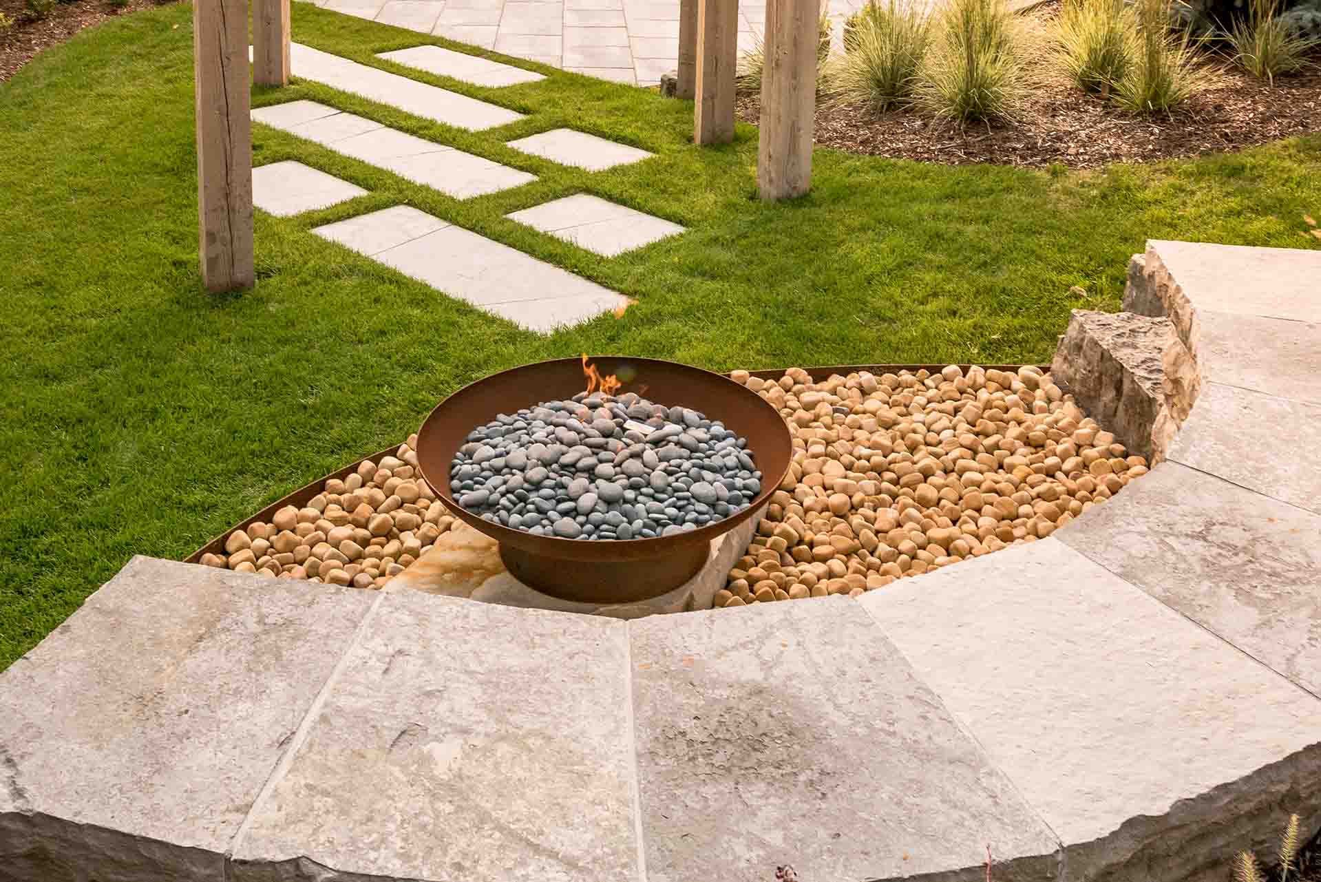 At the heart of the design, a custom metal fire pit serves as a striking sculptural feature and a natural gathering point. Its refined form introduces warmth and contrast, anchoring the patio and surrounding seating areas. Nearby, modern wooden arches define transitions within the landscape, adding architectural rhythm while softly framing views of the garden and pool beyond.
