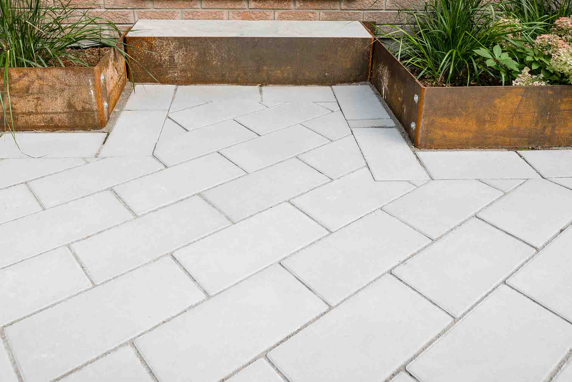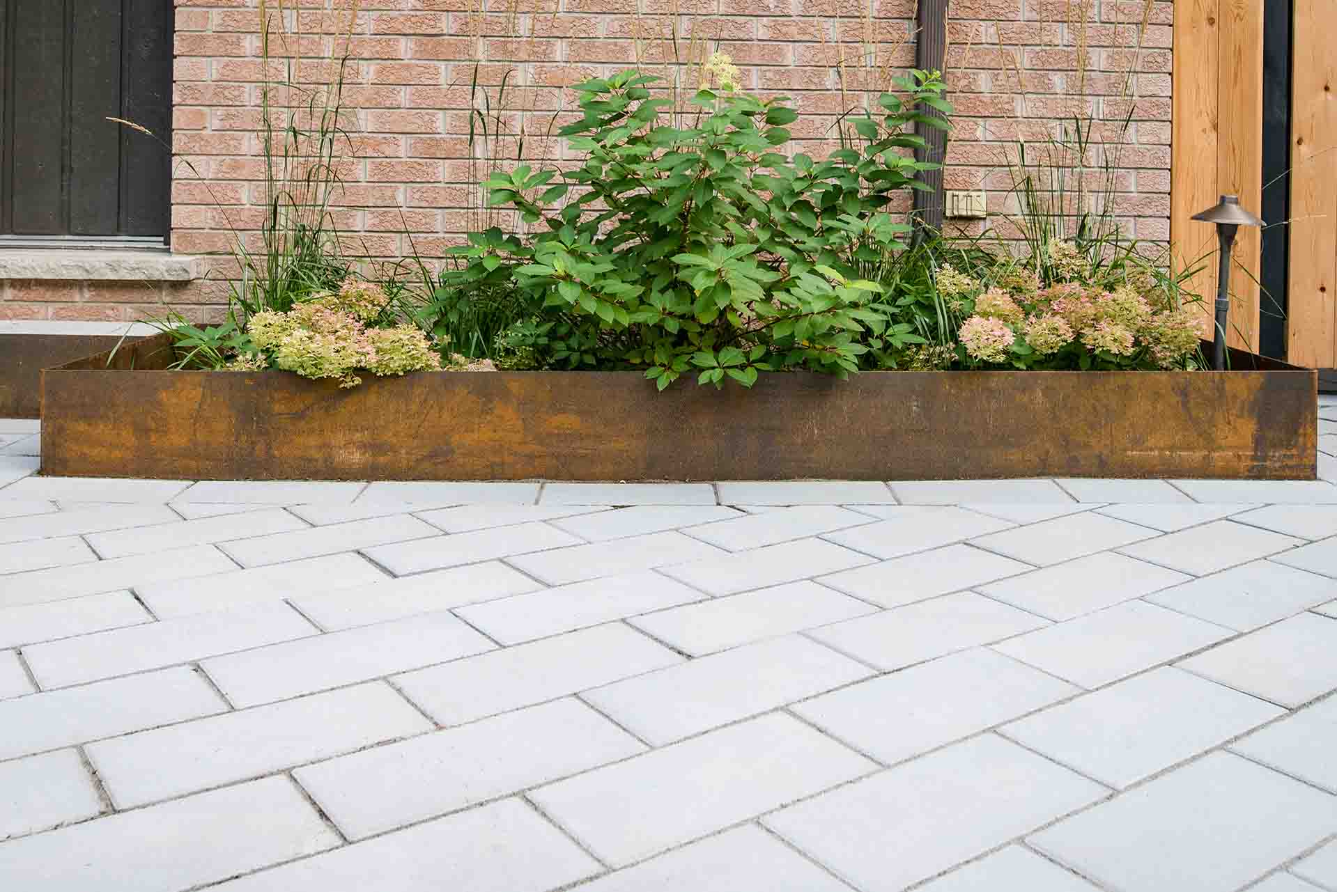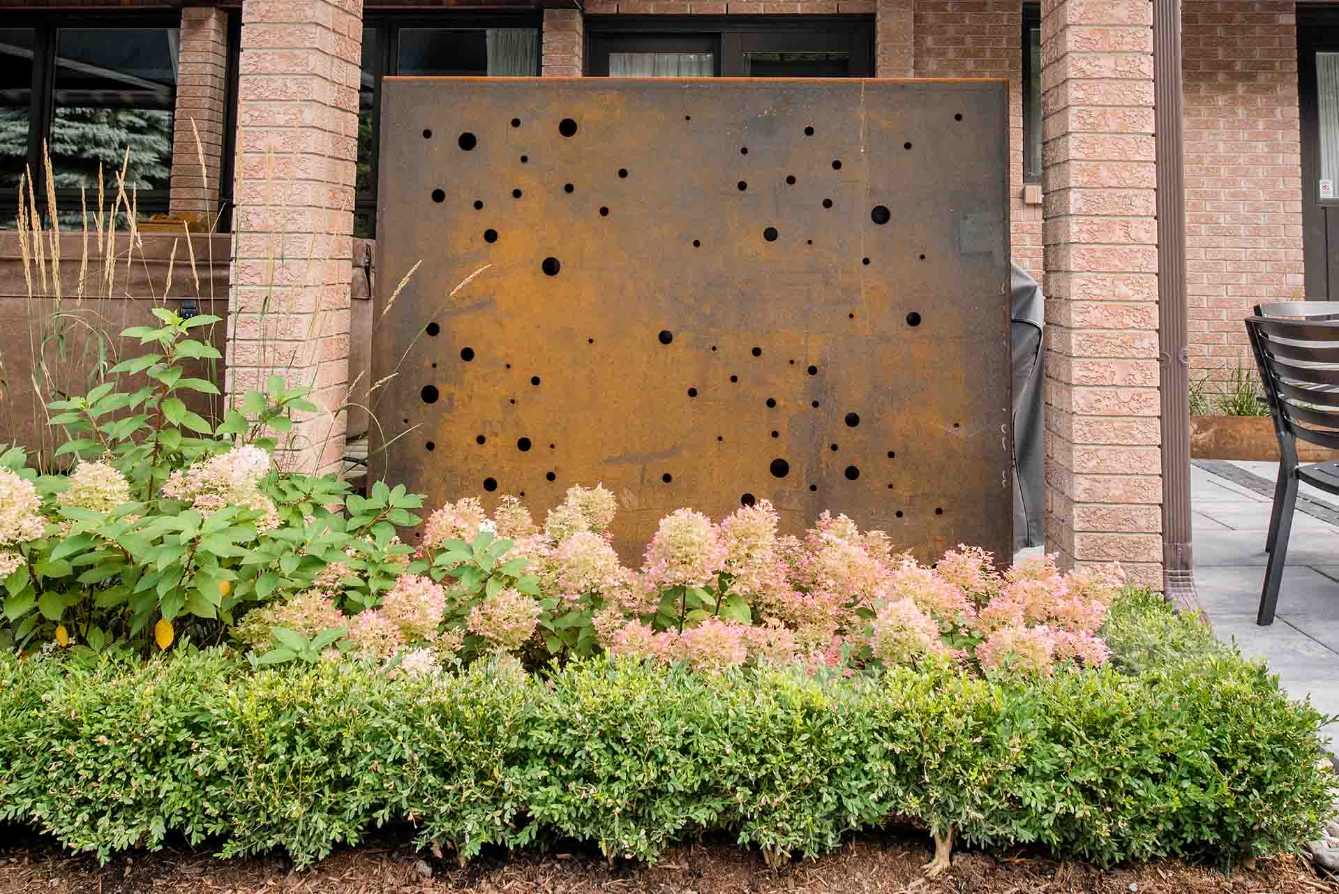 Metal privacy screens are thoughtfully integrated to provide both function and artistry. These screens offer privacy without closing off the space, filtering light and creating dynamic shadow patterns throughout the day. Their clean lines and contemporary finish complement the surrounding materials, reinforcing the seamless blend of art and structure within the landscape.