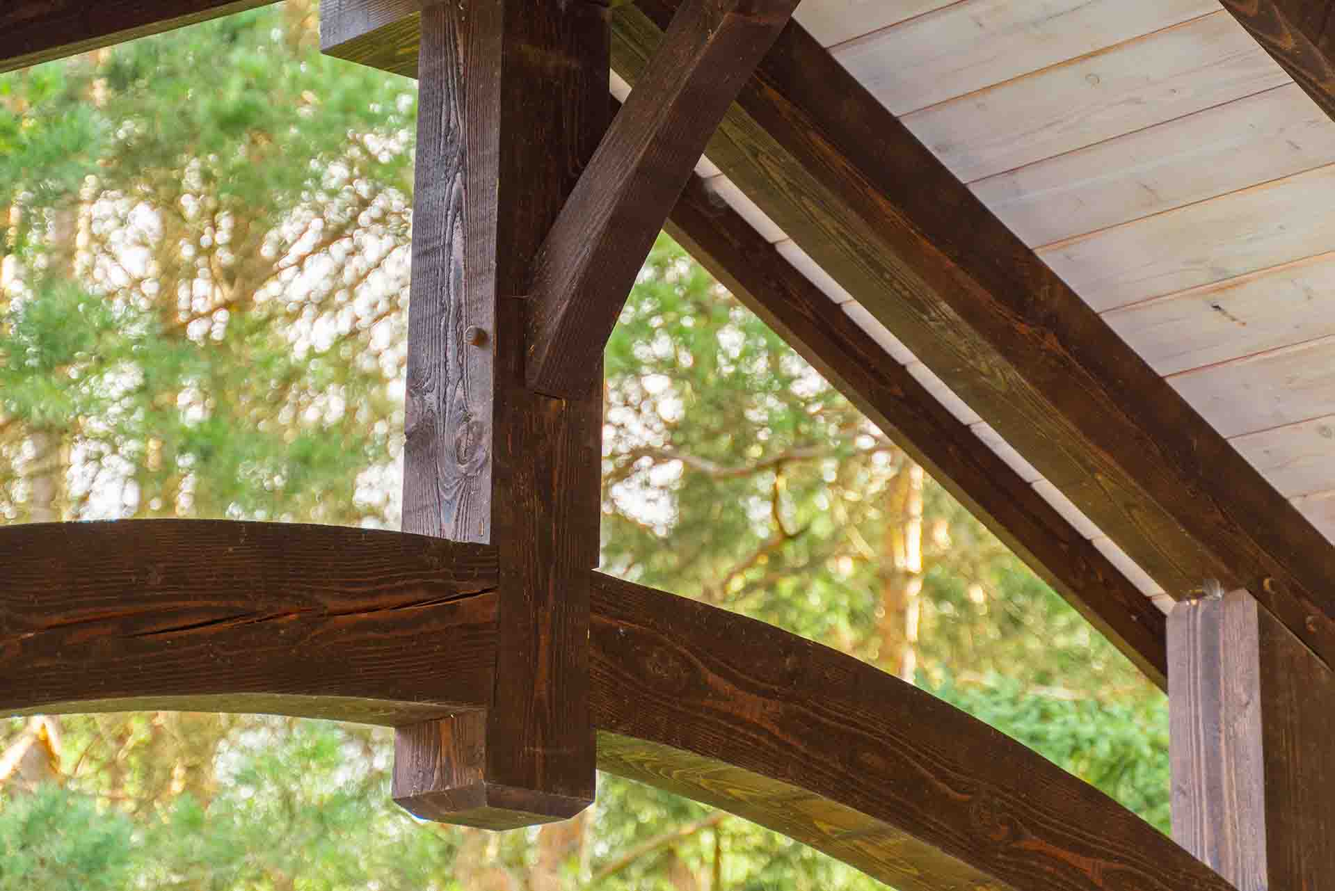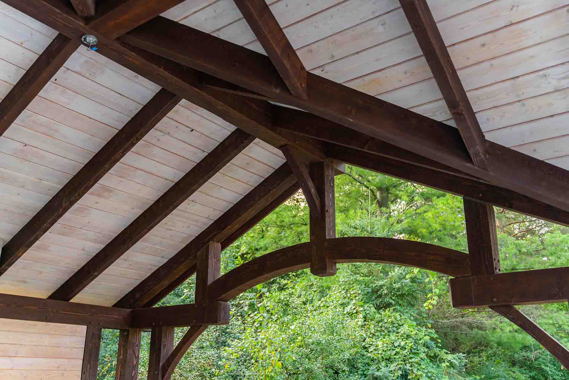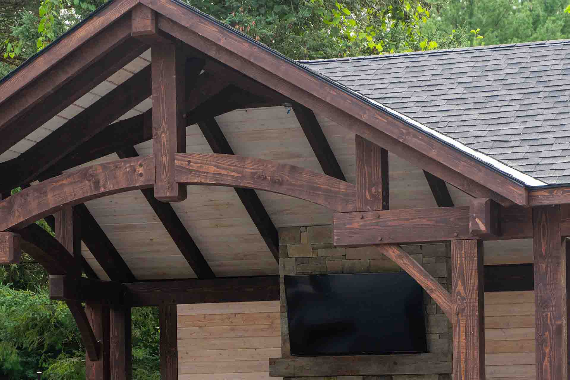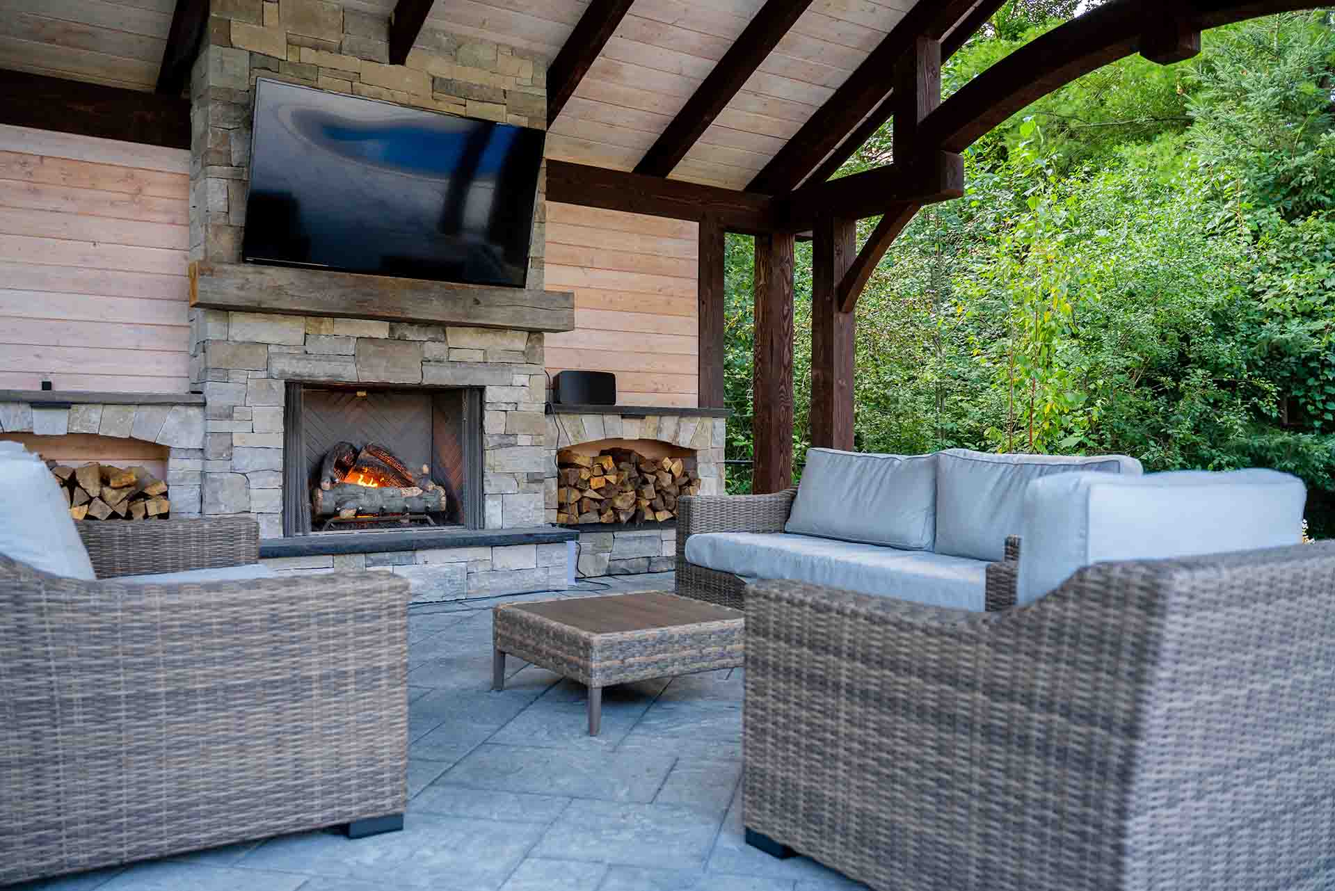 The outdoor living experience continues with a dedicated dining pergola and a fully covered outdoor room framed by a large timber structure. This architectural centerpiece provides shelter and warmth, anchored by a fireplace that allows the space to be enjoyed well beyond the summer months. Whether hosting gatherings or enjoying quiet evenings, the covered structure creates a sense of enclosure and comfort while remaining open to the landscape.