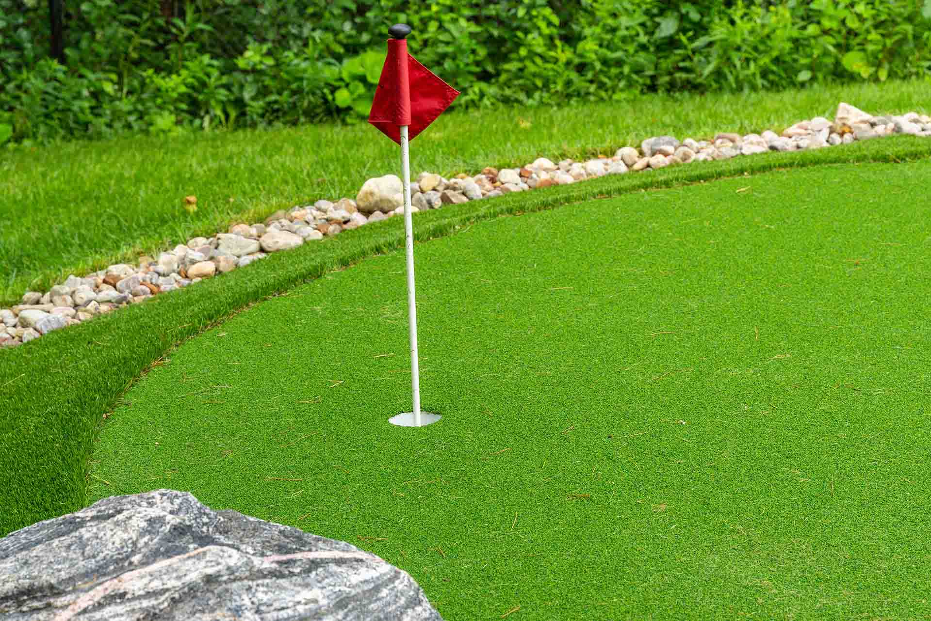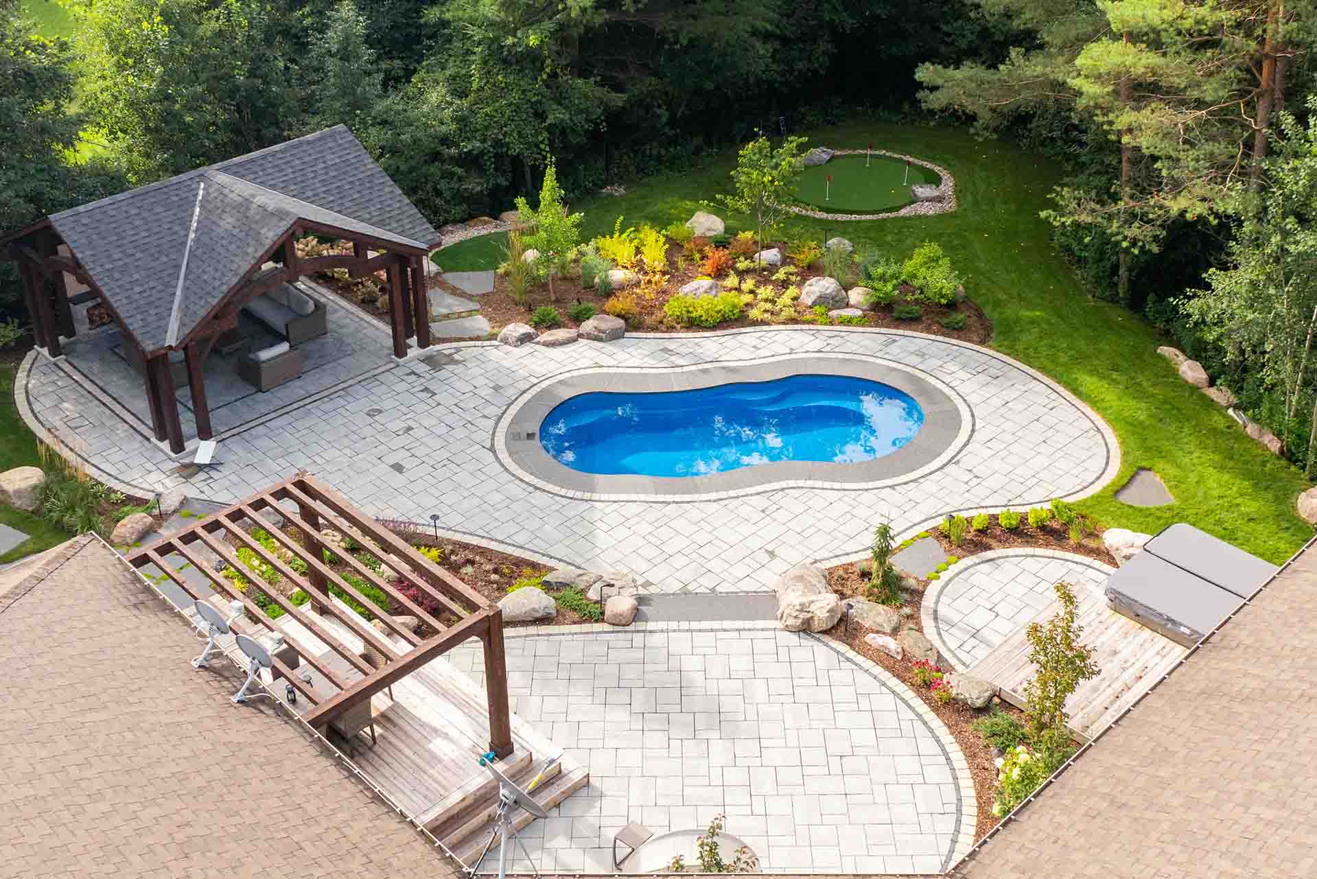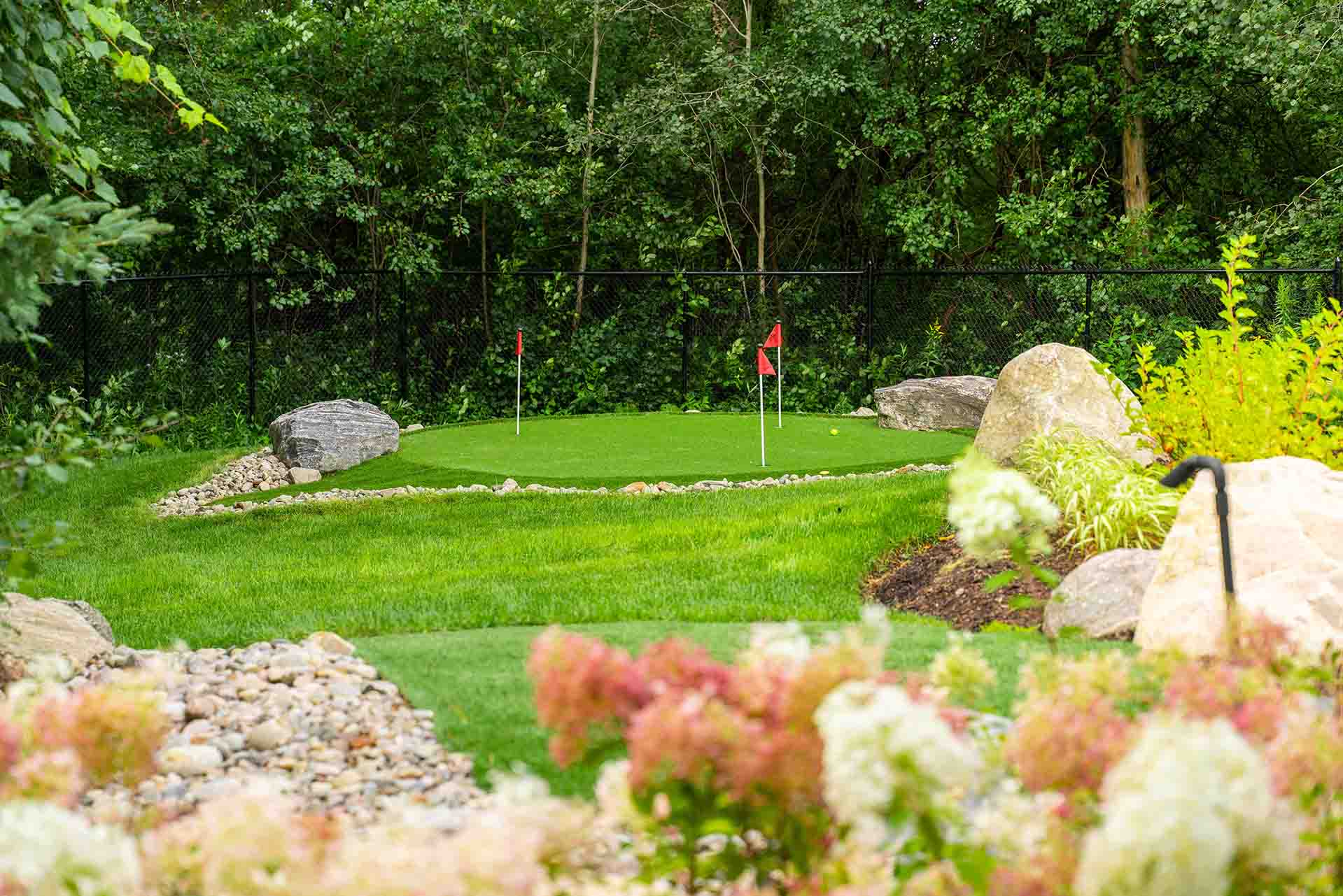 At the heart of the space is a built-in swim spa, offering both recreation and wellness in a refined, resort-style setting. Adjacent to it, a custom mini putting green adds a playful yet polished feature that invites use from family and guests alike. These recreational elements are carefully integrated into the landscape so they feel natural, balanced, and visually connected to the surrounding patios and planting.