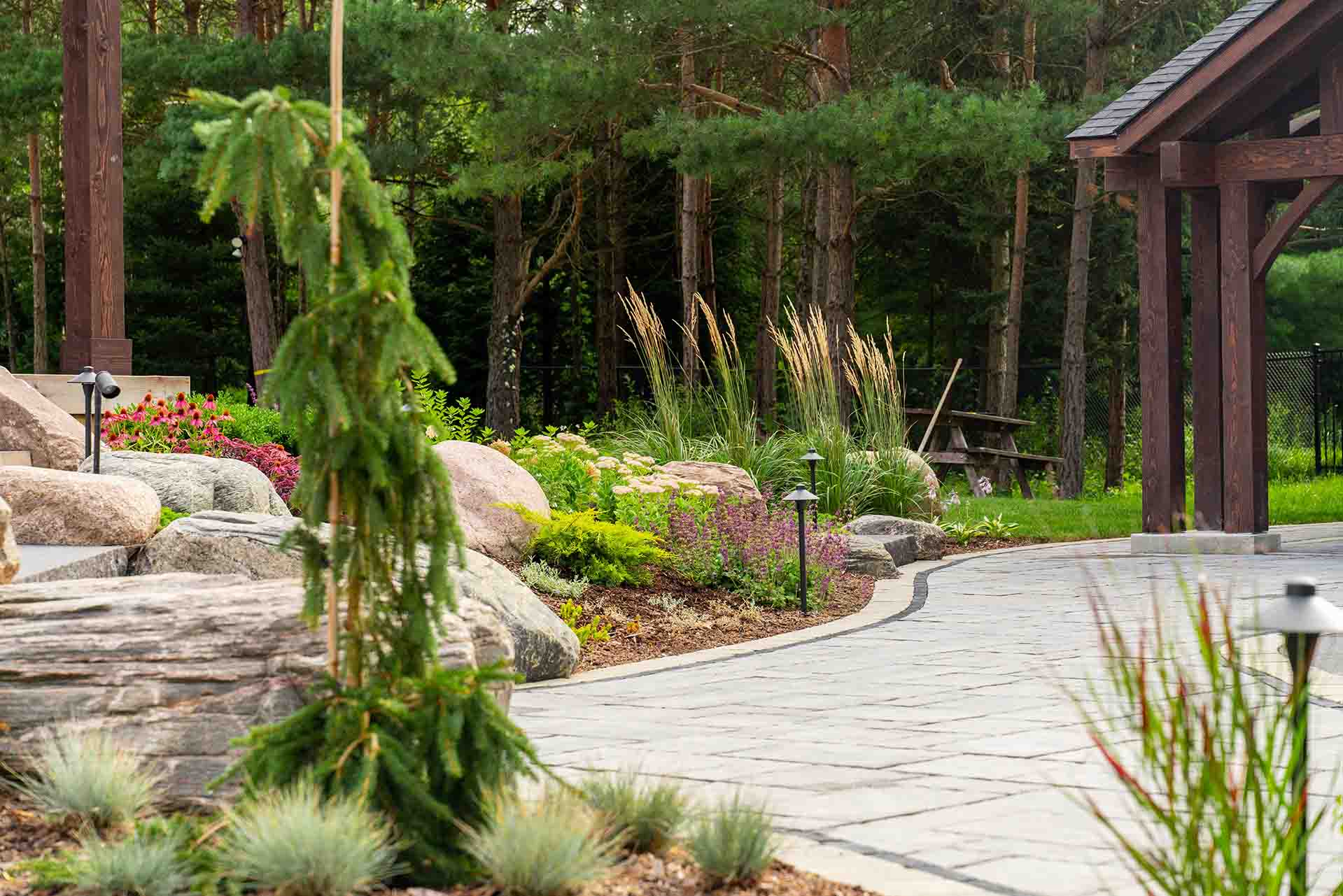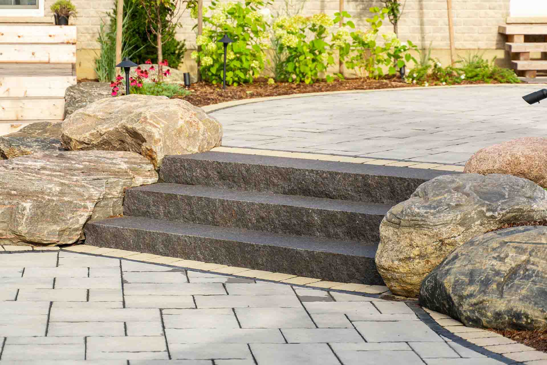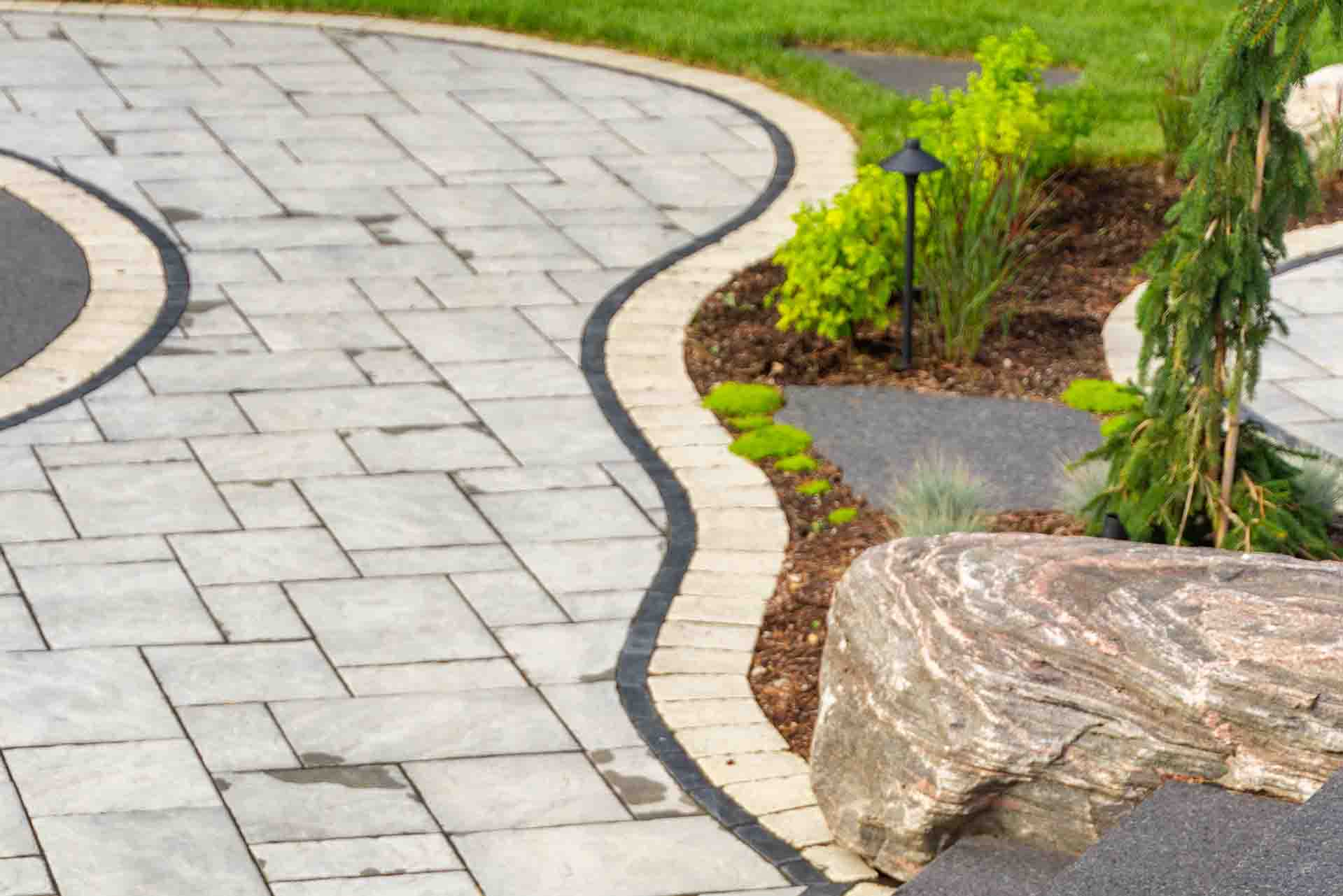 Stonework and interlocking brick define the walkways, patios, and transitions throughout the space, adding texture, durability, and timeless appeal. These hardscape elements guide movement, frame outdoor rooms, and create a strong visual foundation that ties the entire design together. Each surface is selected and installed to complement both the architecture of the home and the surrounding landscape.