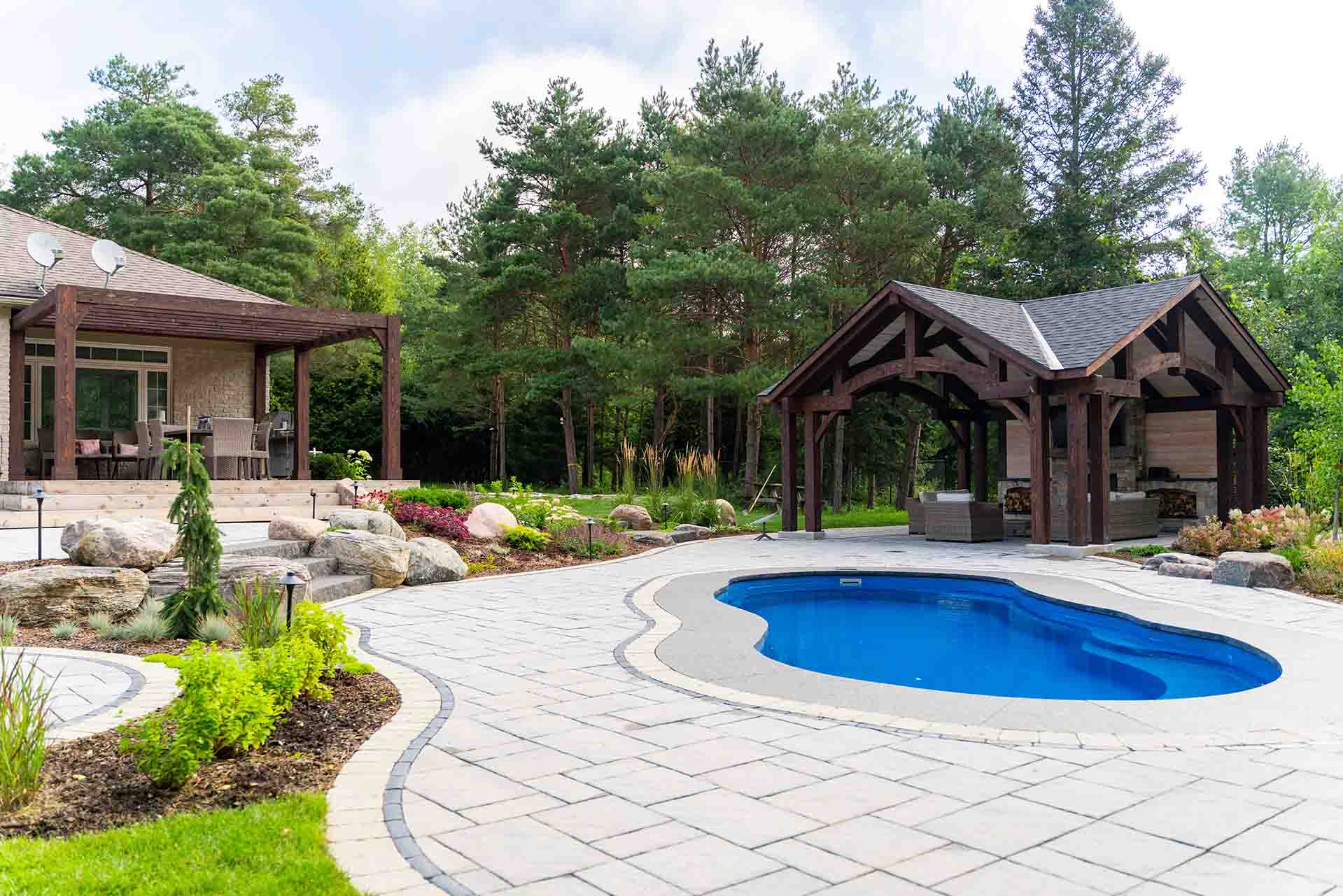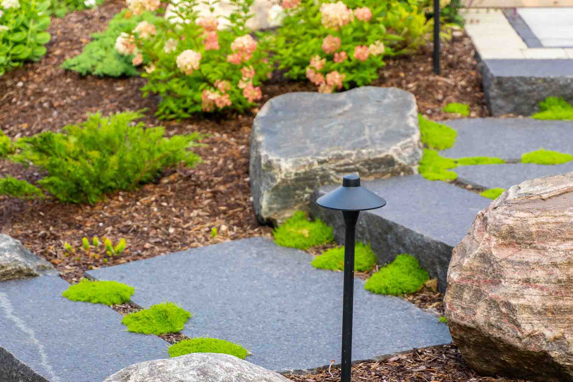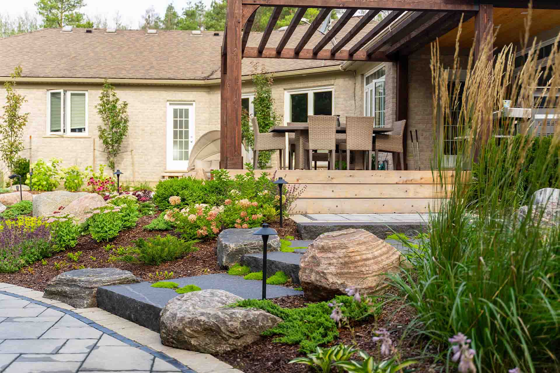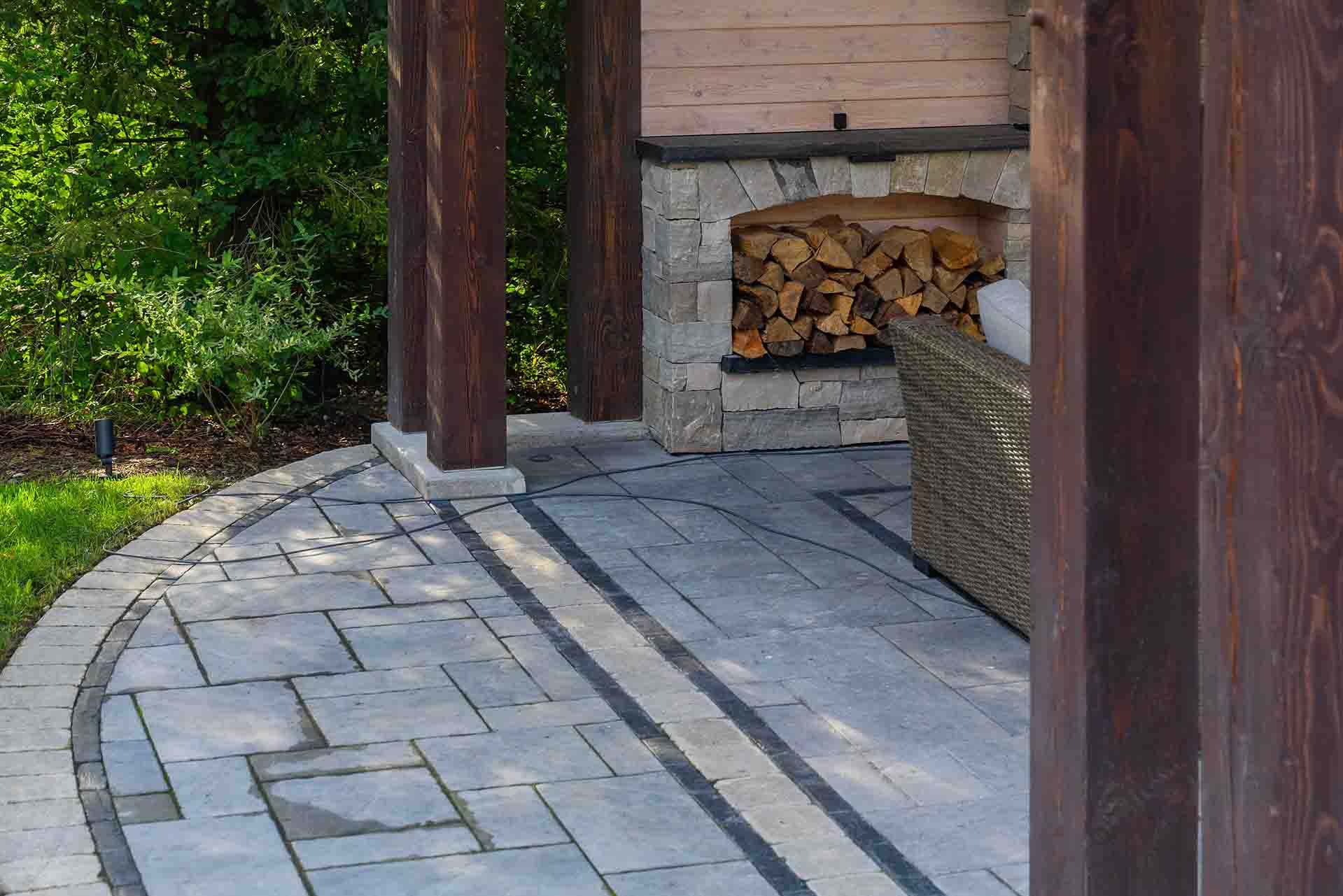 Stonework and interlocking brick define the walkways, patios, and transitions throughout the space, adding texture, durability, and timeless appeal. These hardscape elements guide movement, frame outdoor rooms, and create a strong visual foundation that ties the entire design together. Each surface is selected and installed to complement both the architecture of the home and the surrounding landscape.