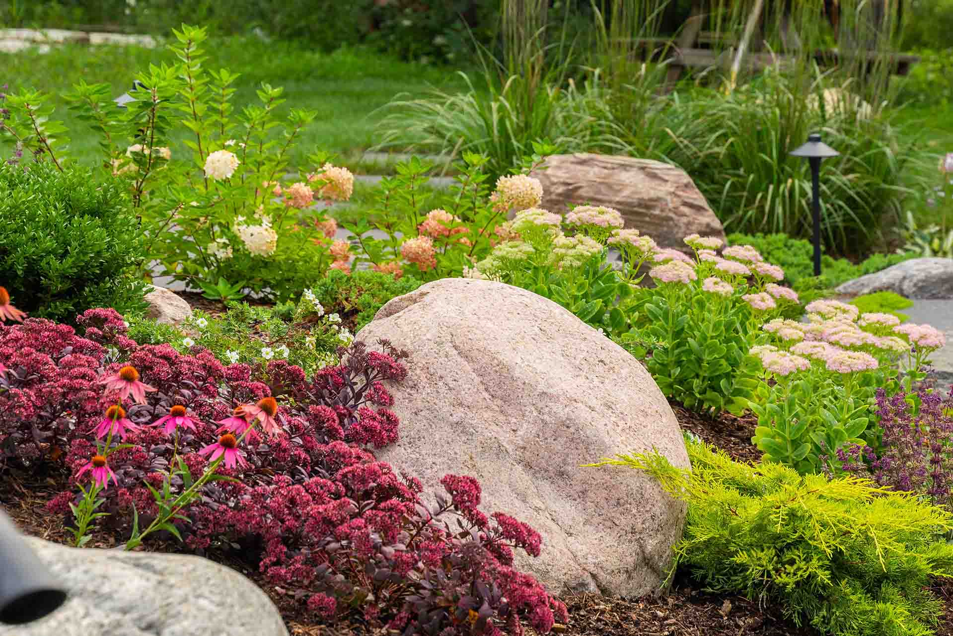 As daylight fades, layered landscape lighting brings the entire environment to life. Soft illumination highlights stone textures, architectural details, pathways, and gathering areas, enhancing safety while creating depth and atmosphere. The result is a fully curated, multi-functional outdoor living space that feels just as intentional and inviting at night as it does during the day—designed for year-round enjoyment and lasting value.