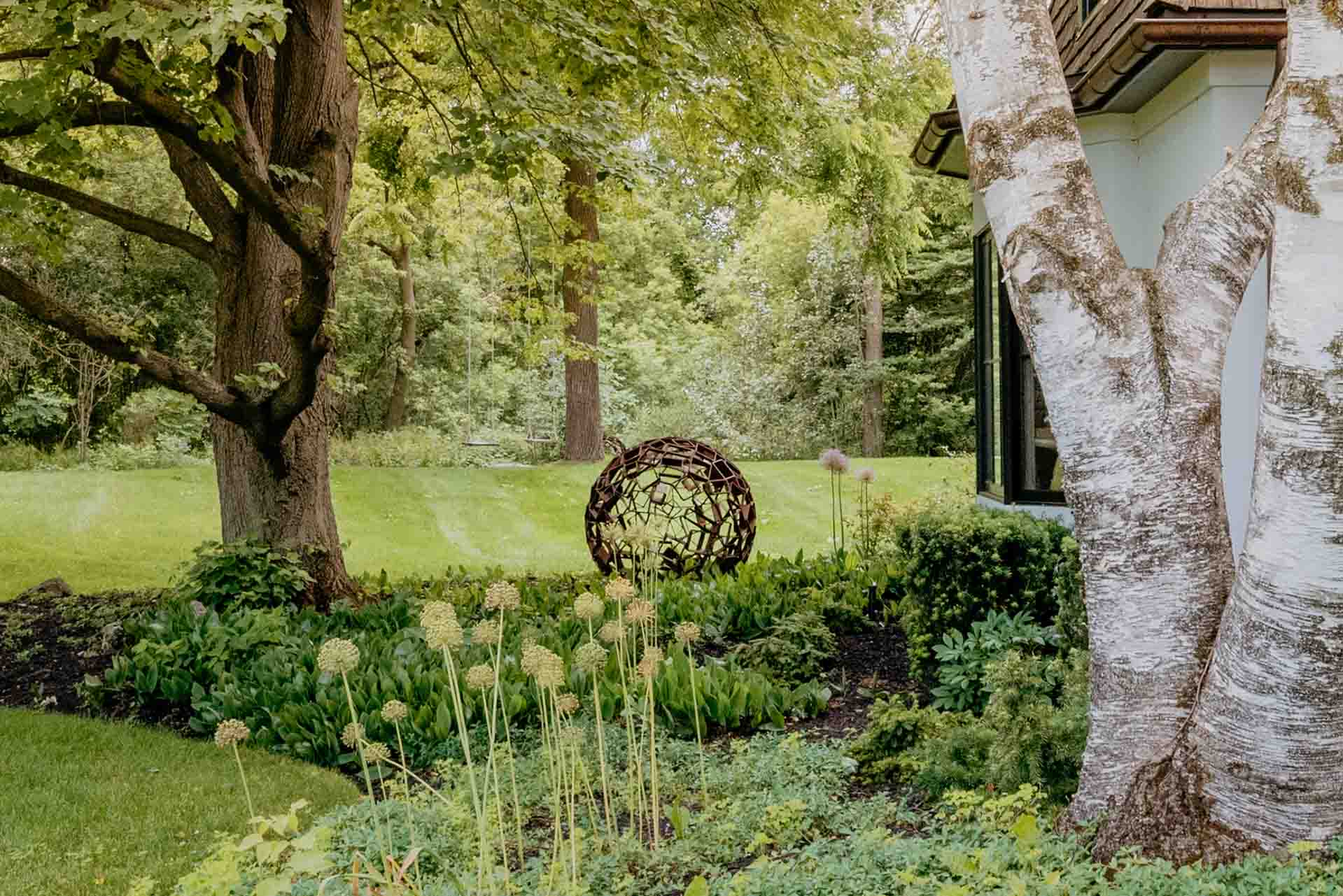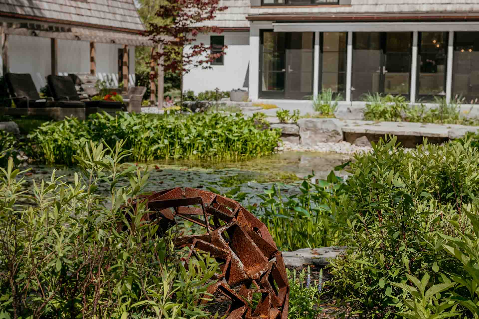 Front curb appeal is elevated through layered planting, architectural accents, and the thoughtful placement of metal art that adds sculptural interest and subtle contrast. These artistic elements introduce personality and depth, catching light and shadow throughout the day while reinforcing the landscape’s refined character. Together, the materials, plantings, and art create a harmonious outdoor environment—one that feels peaceful, expressive, and enduring in every season.