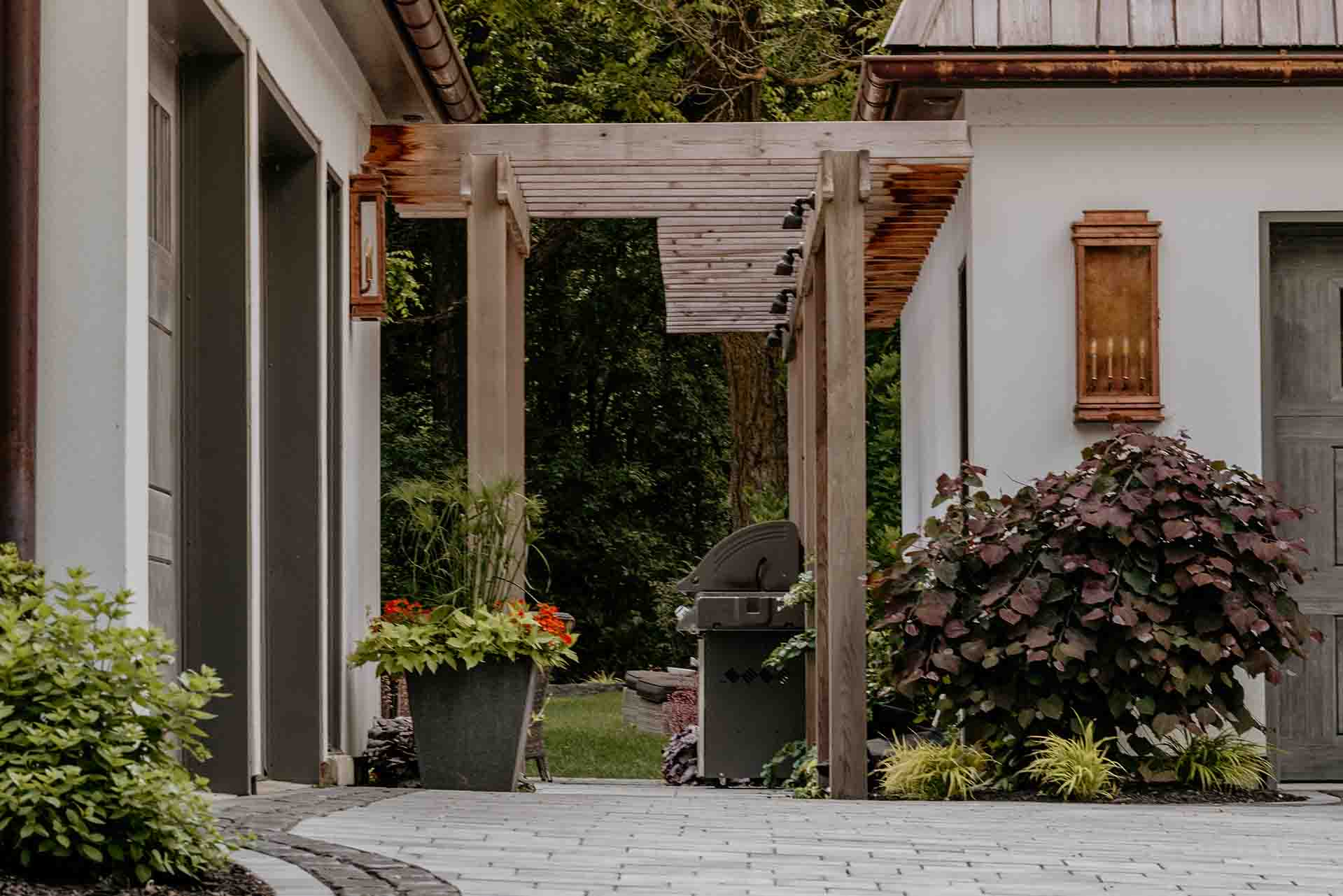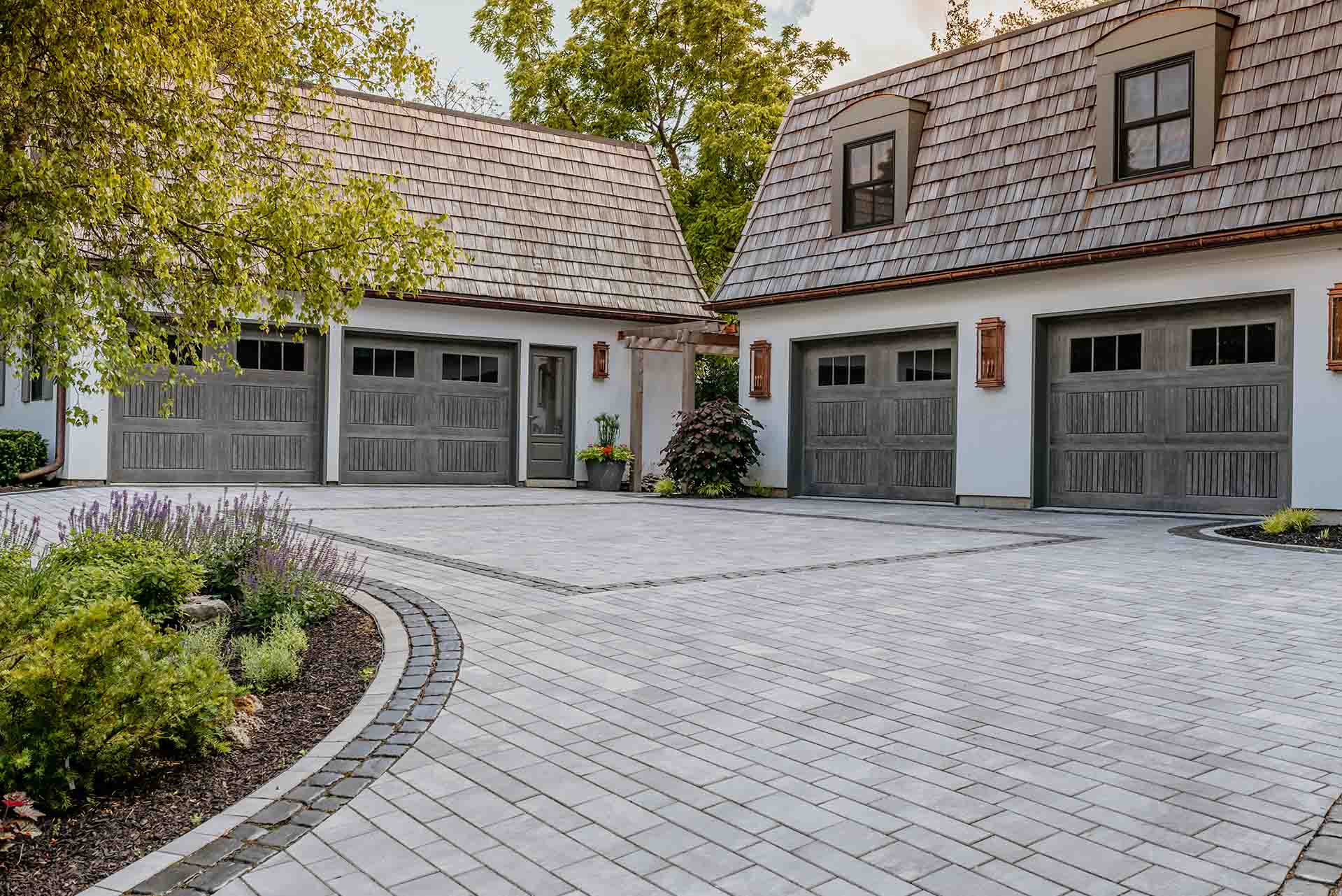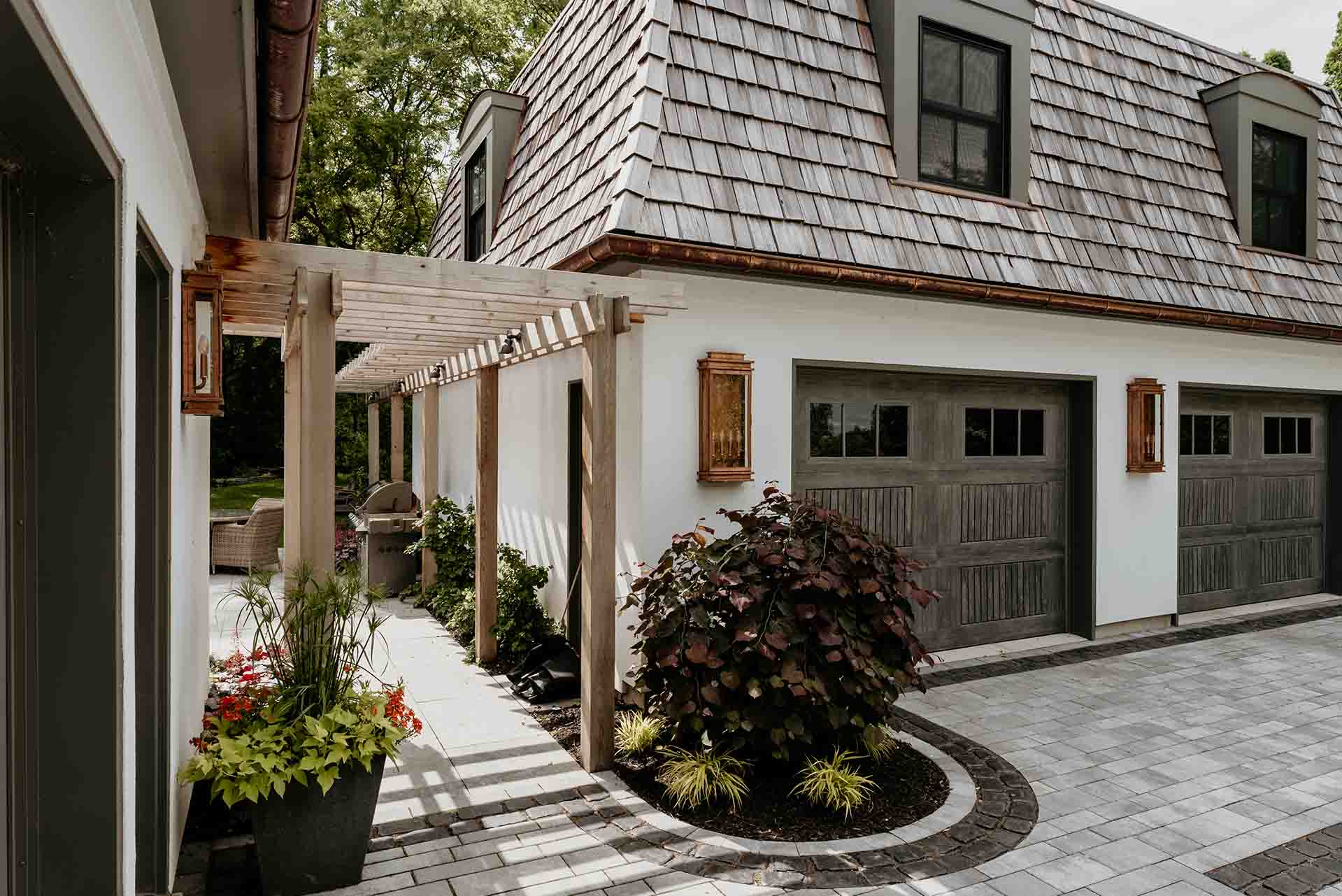 The arrival experience is defined by a thoughtfully designed paving brick driveway and coordinated pathways that establish both structure and elegance. These hardscape elements provide a refined framework for the landscape, balancing durability with visual warmth. As they lead through the property, the pathways create moments of pause and perspective, encouraging exploration while reinforcing a sense of cohesion throughout the space.