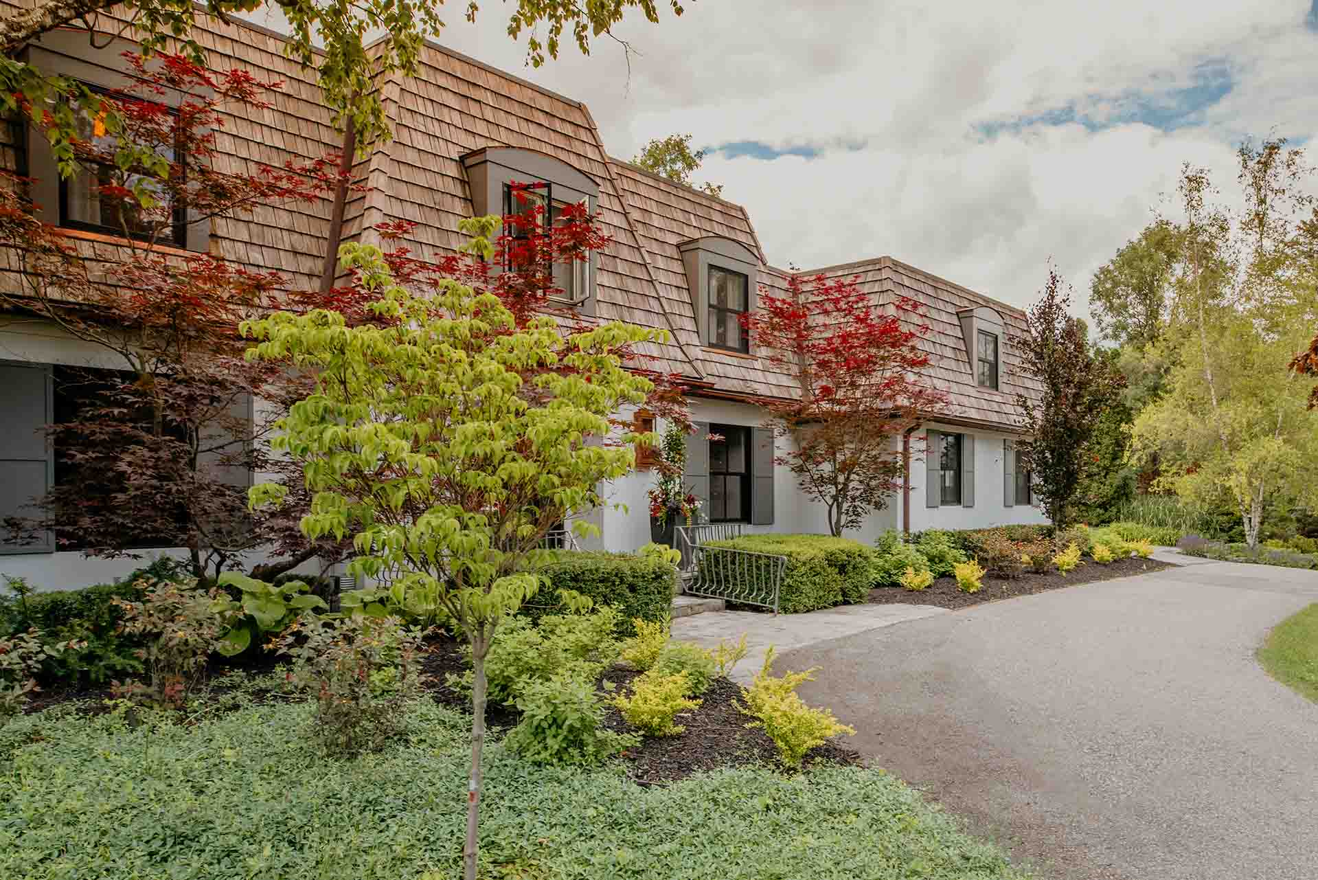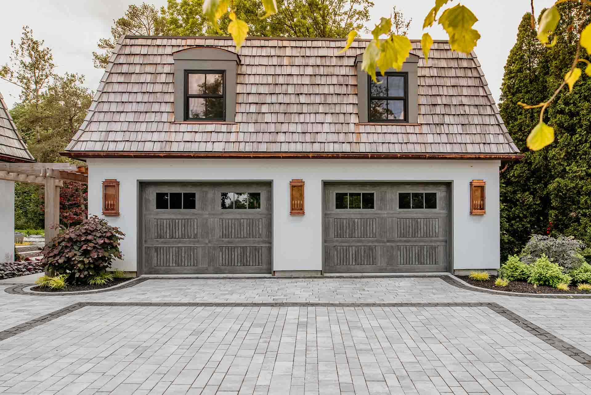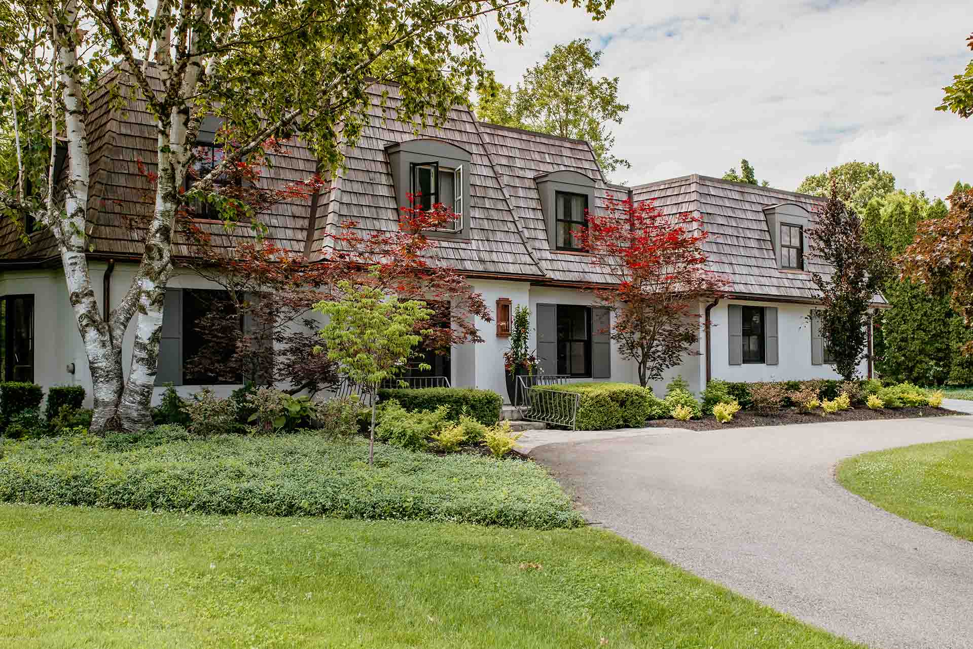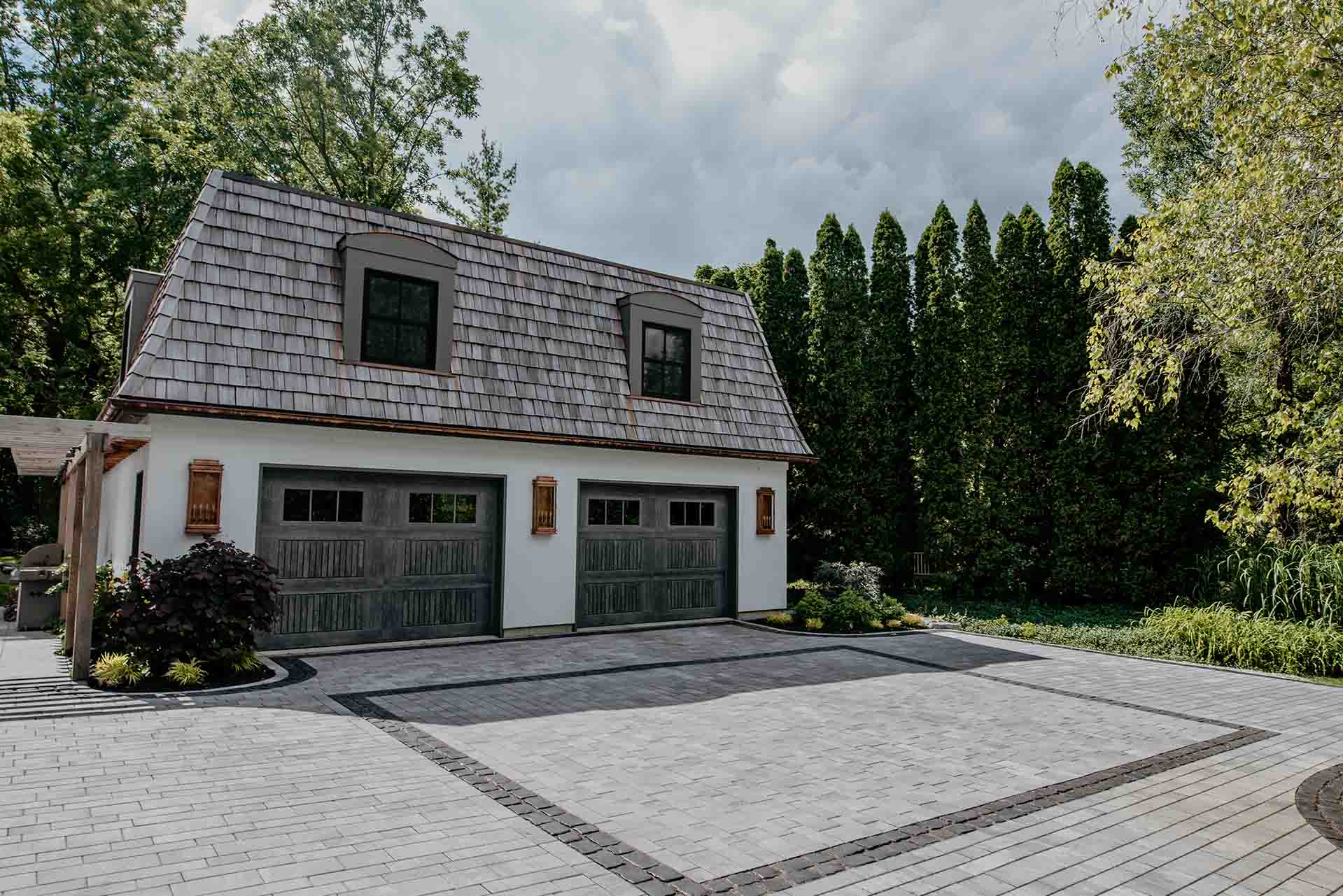 The arrival experience is defined by a thoughtfully designed paving brick driveway and coordinated pathways that establish both structure and elegance. These hardscape elements provide a refined framework for the landscape, balancing durability with visual warmth. As they lead through the property, the pathways create moments of pause and perspective, encouraging exploration while reinforcing a sense of cohesion throughout the space.