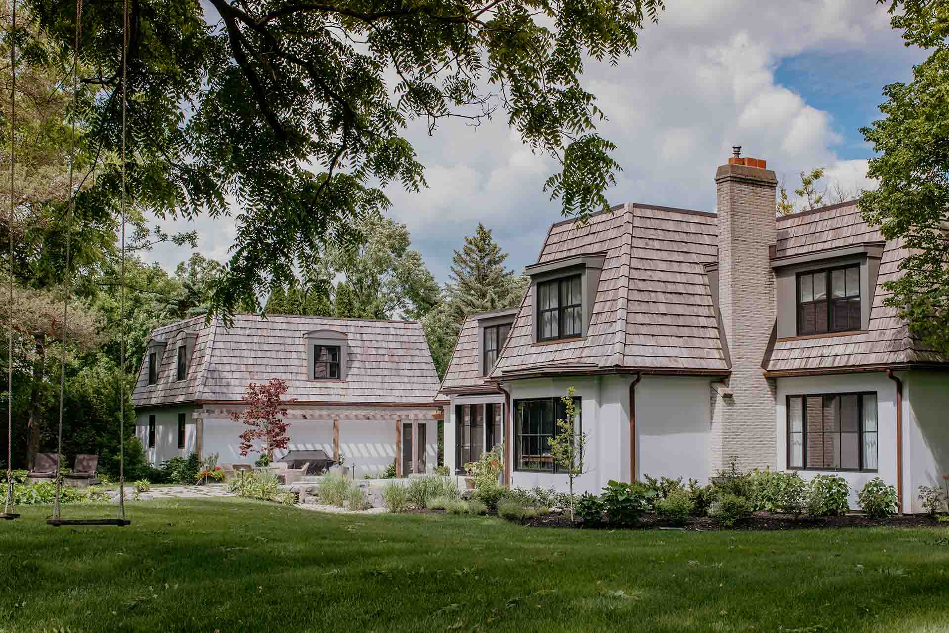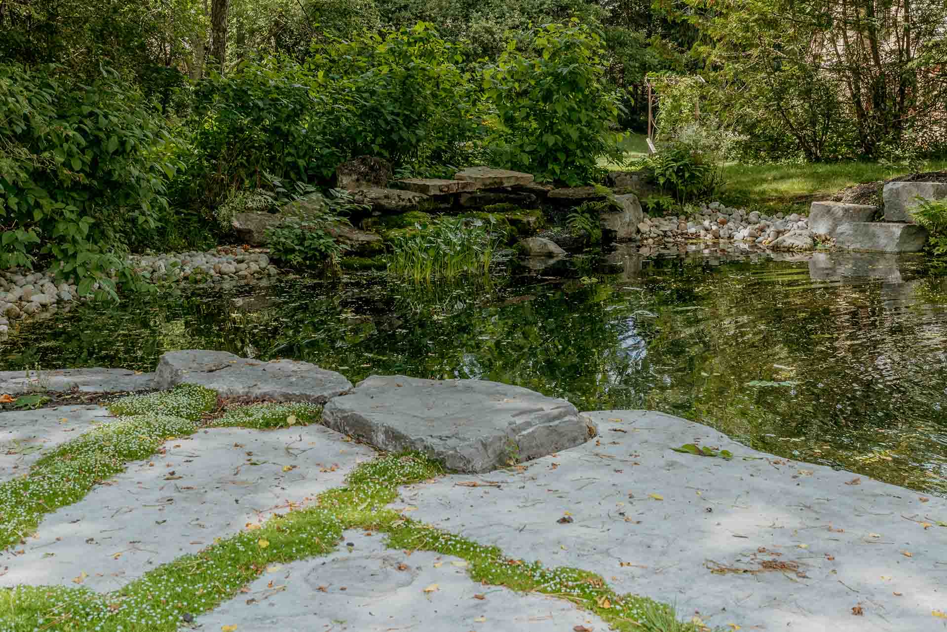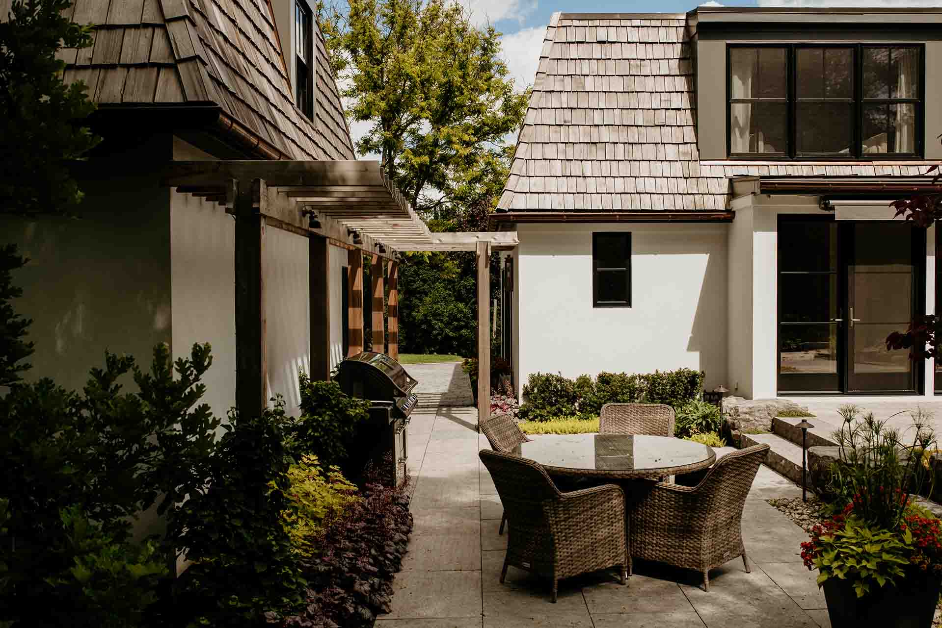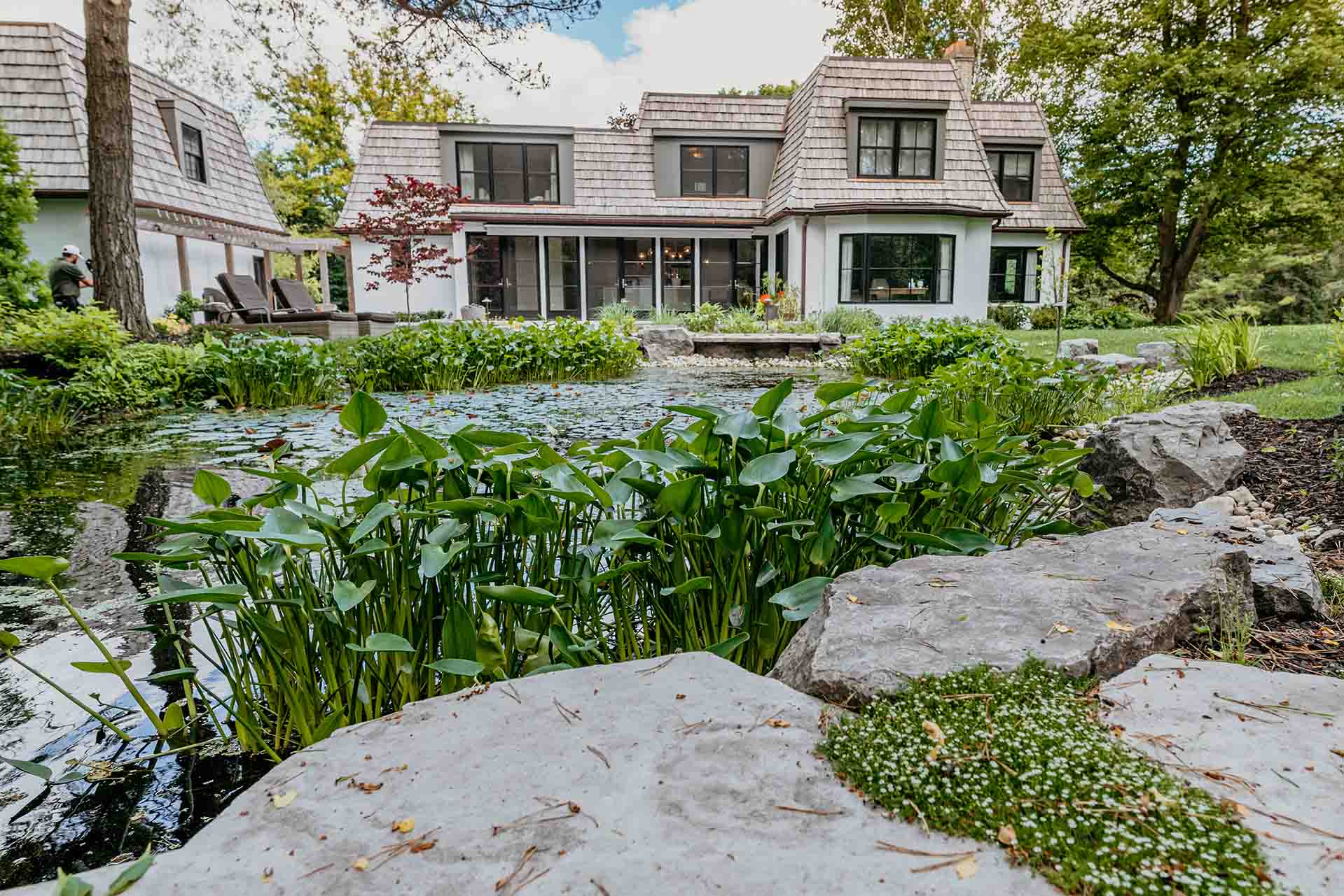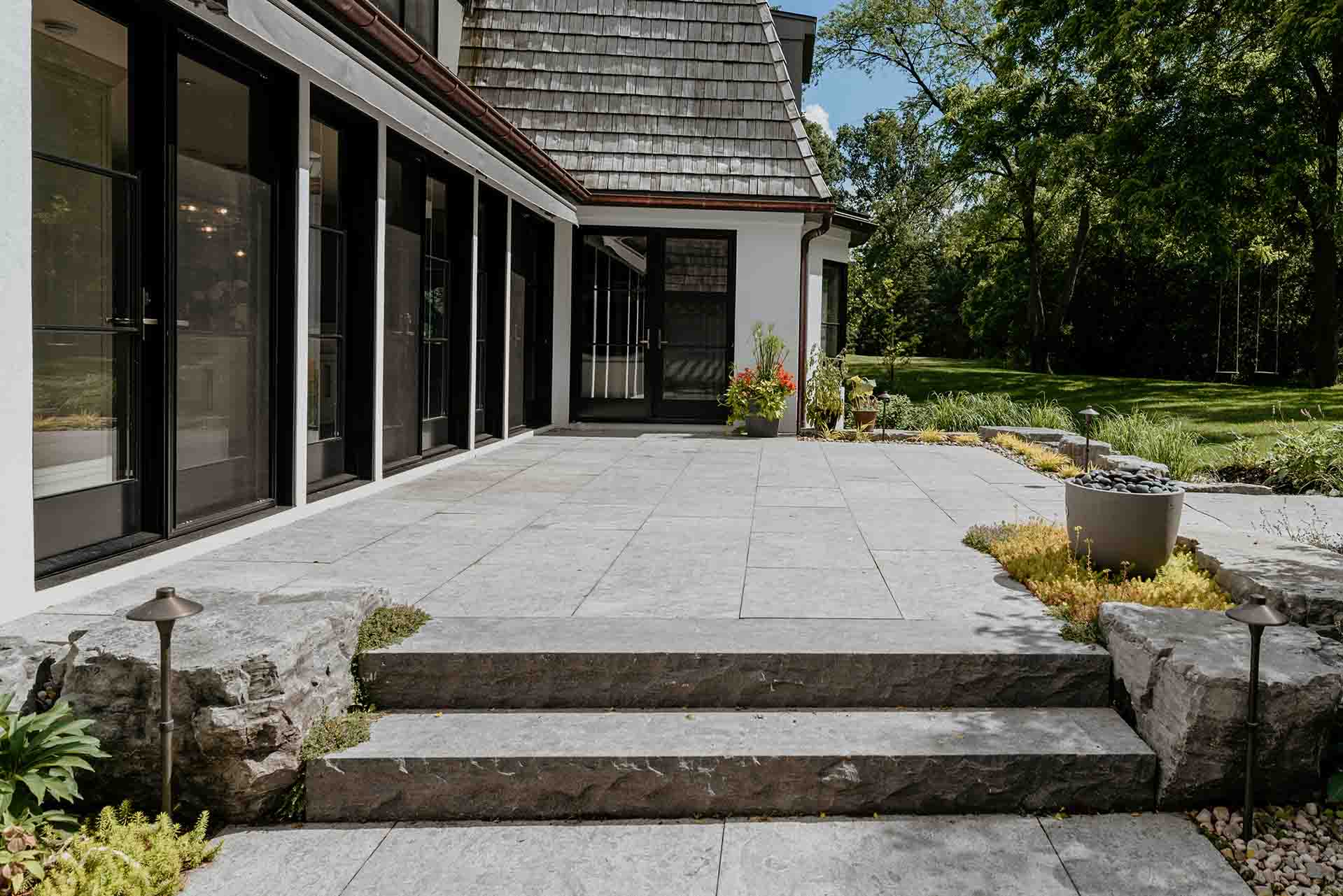 An expansive patio and stone deck form the heart of the outdoor living experience, offering a place to gather, reflect, or simply enjoy the surrounding beauty. Natural stone surfaces provide texture and grounding, seamlessly connecting the built environment with the softer elements of the garden. Whether used for quiet mornings or evening entertaining, the space feels sheltered, intentional, and deeply connected to the landscape around it.